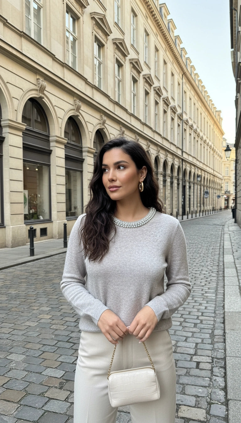 Deze elegante lichtgrijze trui straalt tijdloze klasse uit dankzij de verfijnde parelversiering langs de ronde hals. Gemaakt van een zachte, soepelvallende stof die comfortabel aanvoelt en mooi in model blijft. De subtiele kleur en vrouwelijke details maken deze trui perfect voor zowel casual als chique gelegenheden.