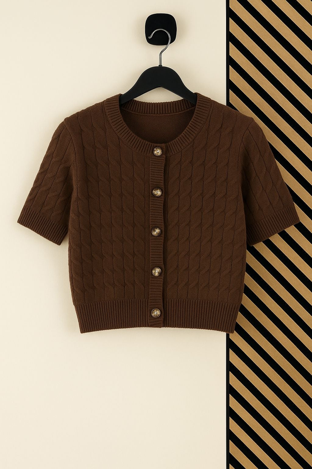 Dit stijlvolle gebreide vest in een diepe chocoladebruine kleur combineert comfort met een verfijnde uitstraling. Het korte, aangesloten model met korte mouwen en een klassiek kabelpatroon geeft een moderne twist aan een tijdloze look. De gouden knoopsluiting aan de voorkant voegt een subtiel, chic detail toe.